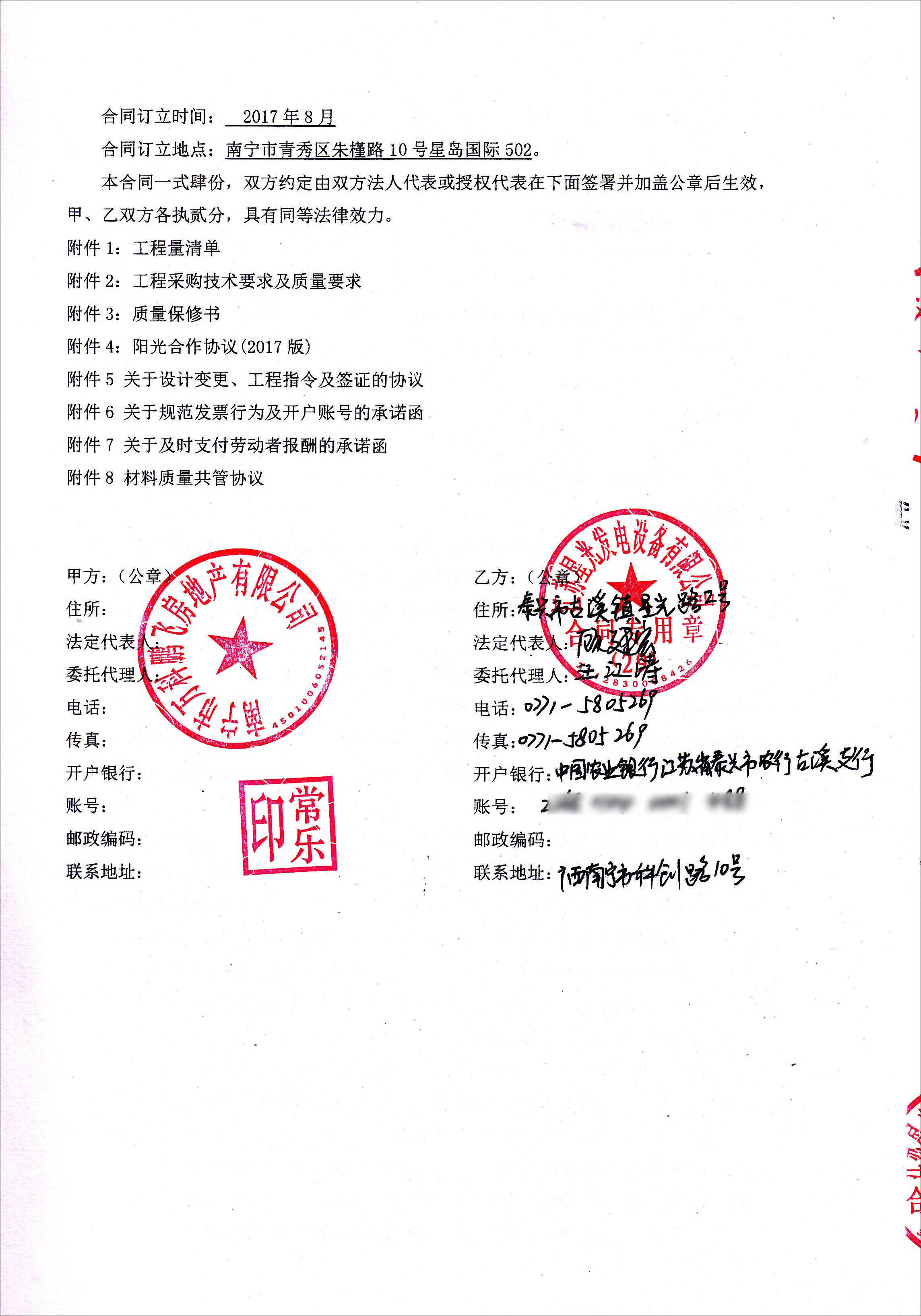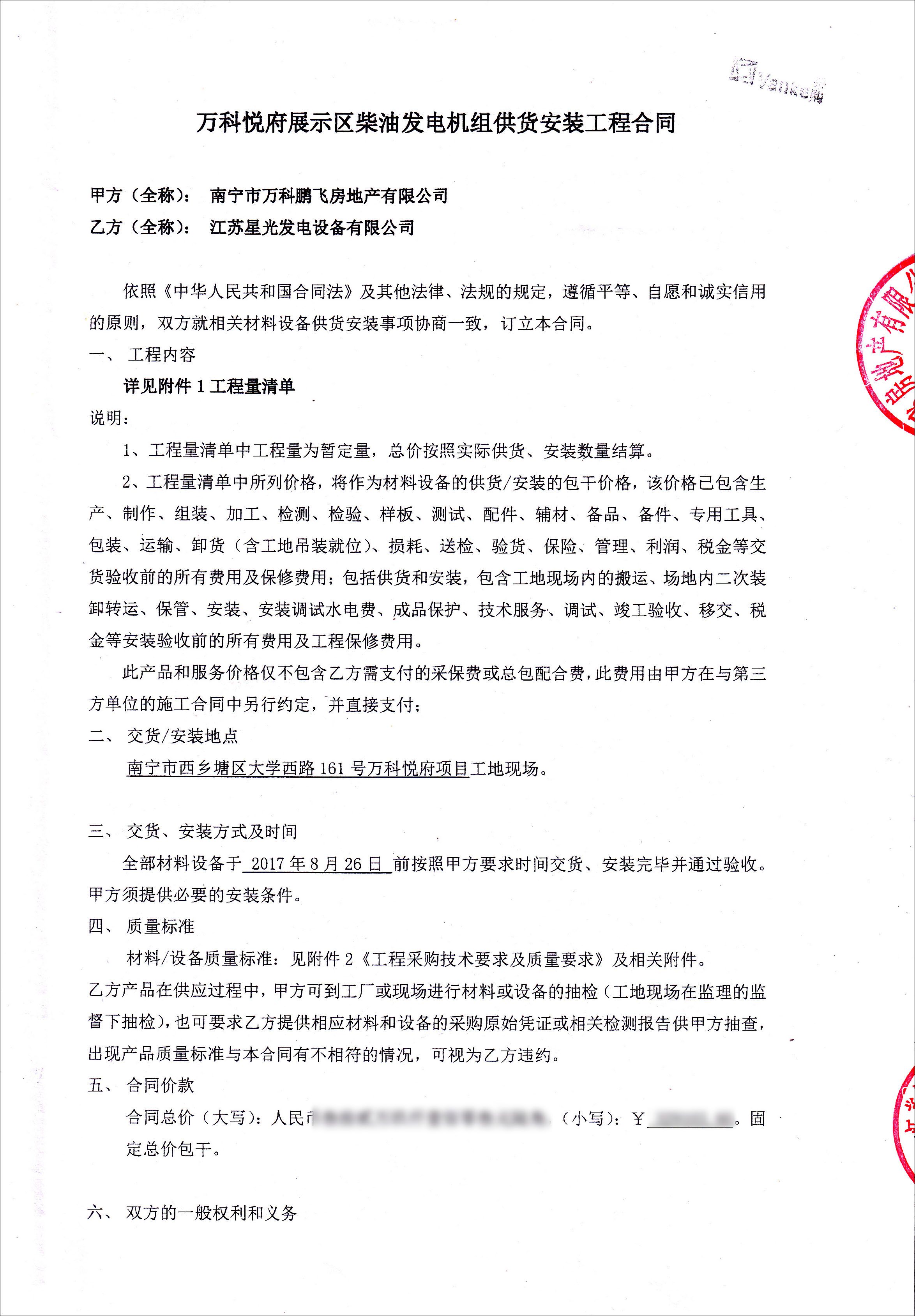 8月,我公司與南寧萬科鵬飛公司簽訂合同,確定我公司為萬科悅府展示區柴油發電機組供貨安裝單位。我公司將嚴格按照合同要求保質保量按時供貨安裝、調試并通過驗收等。