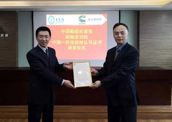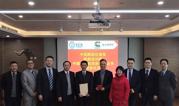 1月10日下午,中國船級社(CCS)向重慶康明斯發動機有限公司(簡稱“重慶康明斯”)頒發了國內首份船舶發動機中國第一階段排放認可證書,這標志著國內船舶行業在踐行綠色航運理念方面邁出了新的步伐。