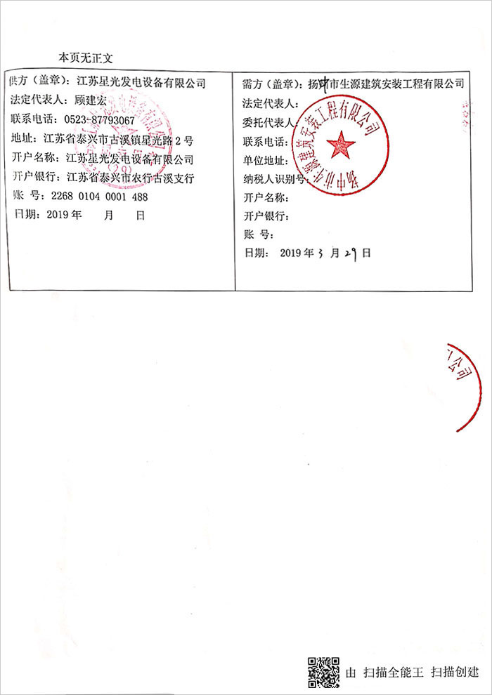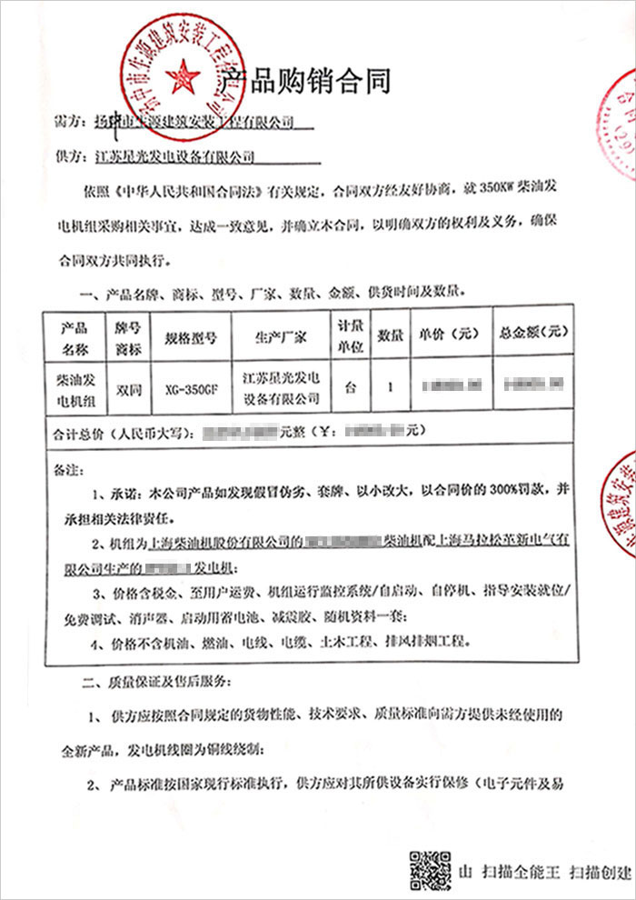 江蘇星光動力集團 >> 新聞動態 >> 恭喜我公司和揚中市生源建筑安裝公司第二次合作,成功簽訂一臺350KW上柴發電機