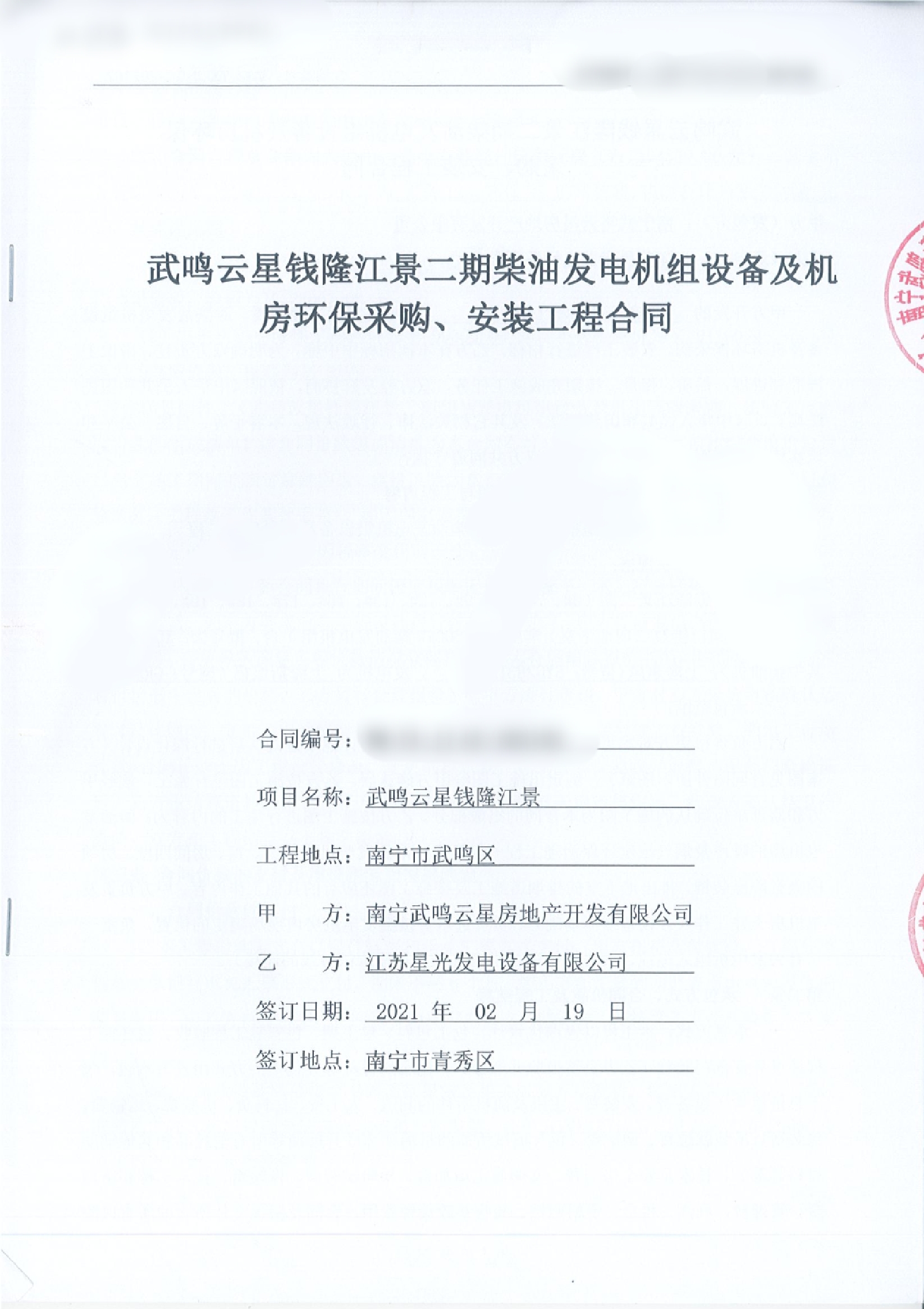 2021年2月19日,江蘇星光發(fā)電設(shè)備有限公司與南寧武鳴云星房地產(chǎn)開發(fā)有限公司再次成功簽訂了一臺600KW型號為XG-600GF柴油發(fā)電機(jī)組,其中柴油機(jī)為上海東風(fēng)(型號SYG283TAD72),發(fā)電機(jī)為上海斯坦福(型號GR355G),該機(jī)組用于的是武鳴云星錢隆江景二期。