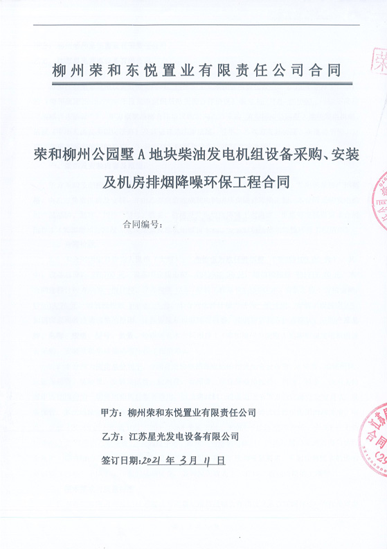 2021年3月11日,江蘇星光發(fā)電設(shè)備有限公司與榮和·柳州公園墅A地塊簽訂一臺580KW柴油發(fā)電機(jī)組,其中發(fā)動機(jī)為型號WD287TAD61L無錫動力及EG355-600N英格發(fā)電機(jī),該機(jī)組用于榮和·柳州公園墅A地塊。我司將在約定時間內(nèi)負(fù)責(zé)供貨及安裝,并且完成發(fā)電機(jī)房環(huán)保隔音降噪工廠。