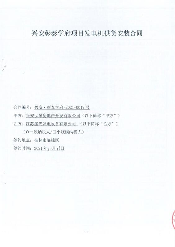 星光公司作為彰泰集團(tuán)多年的柴油發(fā)電機(jī)組戰(zhàn)略采購及安裝戰(zhàn)略供應(yīng)商,和彰泰集團(tuán)保持著友好合作關(guān)系。江蘇星光發(fā)電設(shè)備有限公司與彰泰集團(tuán)的興安弘彰房地產(chǎn)開發(fā)有限公司簽訂600KW柴油發(fā)電機(jī)組協(xié)議。該機(jī)組用于興安彰泰學(xué)府項(xiàng)目備用電源。