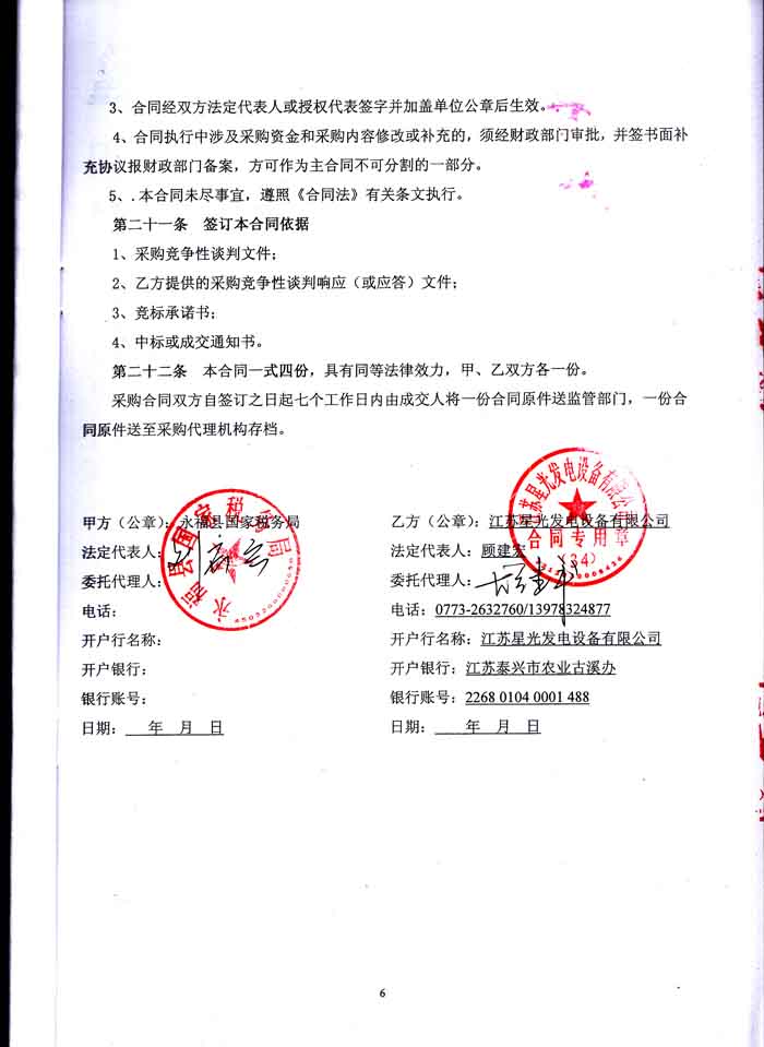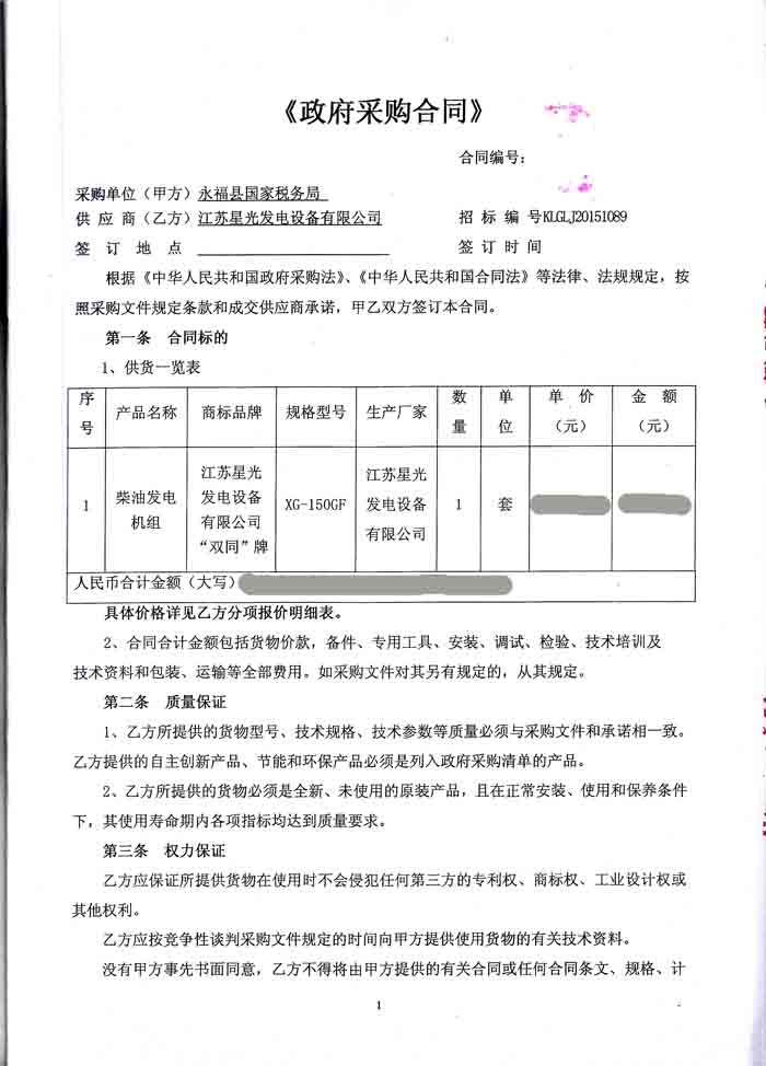 2015年12月28日,廣西永福縣國家稅務局與我公司簽訂了150KW發電機組購銷合同,我公司為其提供里卡多柴油發電機配星光發電機的柴油發電機組一臺。江蘇星光動力集團自成立以來就以技術創新為己任,設計生產的柴油發電機組一直在同行業中遙遙領先,得到各種外界人士的認可。發電機產品購銷合同如下: