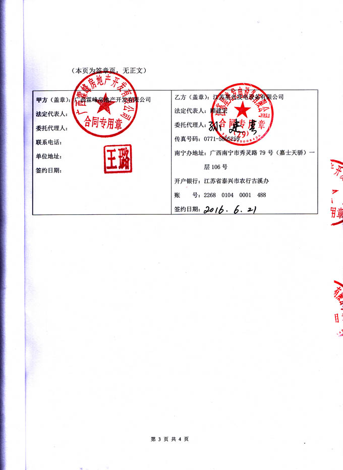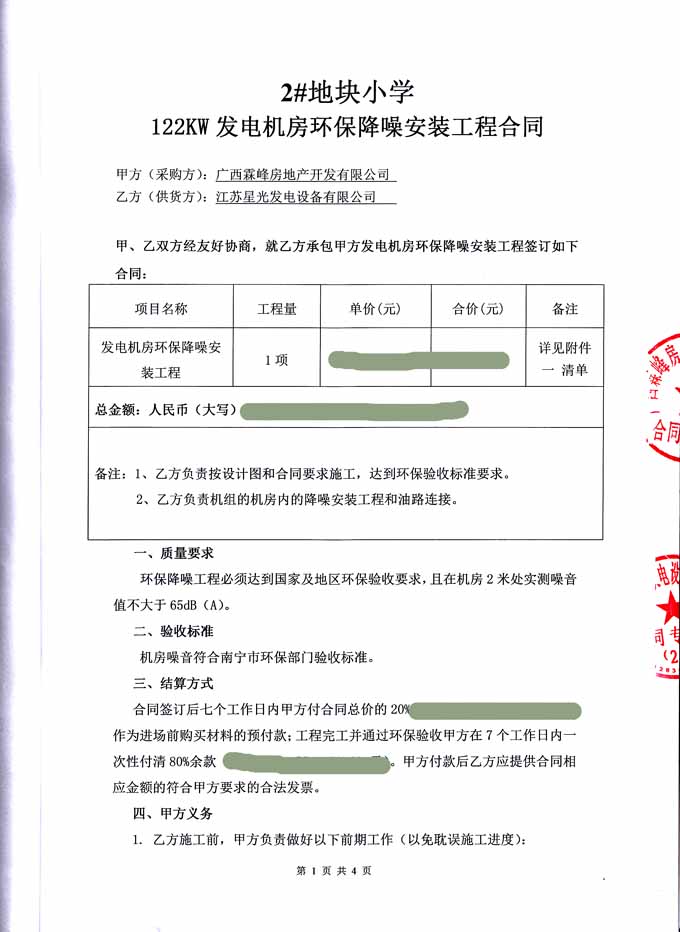 2016年6月21日 我公司與廣西霖峰房地產開發有限公司成功簽訂2#塊地小學122KW發電機房環保降噪安裝工程合同,我公司為其提供一臺里卡多柴油發電機組(機組配置為江蘇里卡多發動機配星光發電機)的機房環保降噪除塵安裝工程的工作,我公司負責工程所需材料購買、安裝和油路連接,并保證工程達到環保驗收標準要求。合同如下: