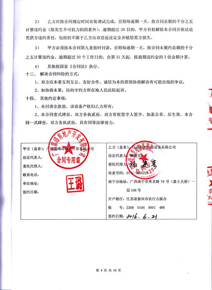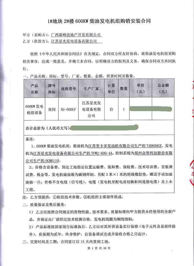 2016年6月21日,我星光公司與廣西霖峰房地產開發有限公司簽訂1#塊地2#樓 600KW柴油發電機組購銷安裝合同,我公司為其提供機組配置為江蘇里卡多發動機配星光發電機及鄭州眾智控制器的發電機組一臺。發電機產品購銷合同如下: