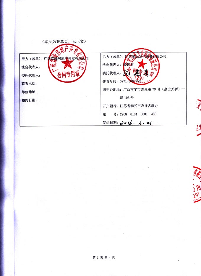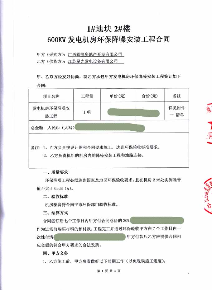 2016年6月21日 我公司與廣西霖峰房地產開發有限公司成功簽訂1#塊地2#樓600KW發電機房環保降噪安裝工程合同,我公司為其提供一臺柴油發電機組(機組配置為江蘇里卡多發動機配星光發電機)的機房環保降噪除塵安裝工程的工作,我公司負責工程所需材料購買、安裝和油路連接,并保證工程達到環保驗收標準要求。合同如下: