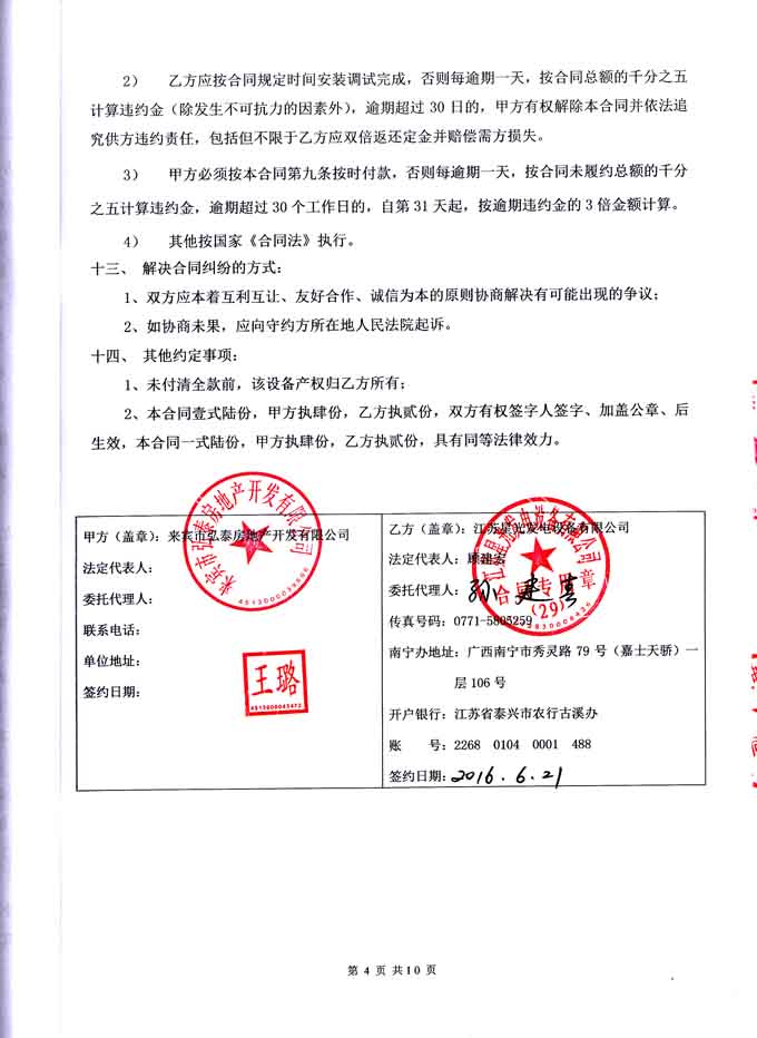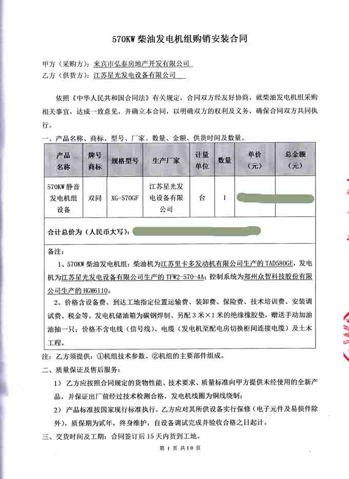 2016年6月21日,來賓市弘泰房地產開發有限公司與我公司簽訂570KW柴油發電機組采購銷安裝合同,我公司為其提供570KW靜音發電機組設備一臺,機組配置為江蘇里卡多發動機配星光發電機及眾智控制器。我公司負責機組的運輸、安裝調試及操作人員的技術培訓。發電機產品購銷合同如下: