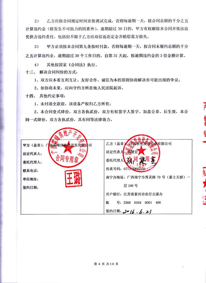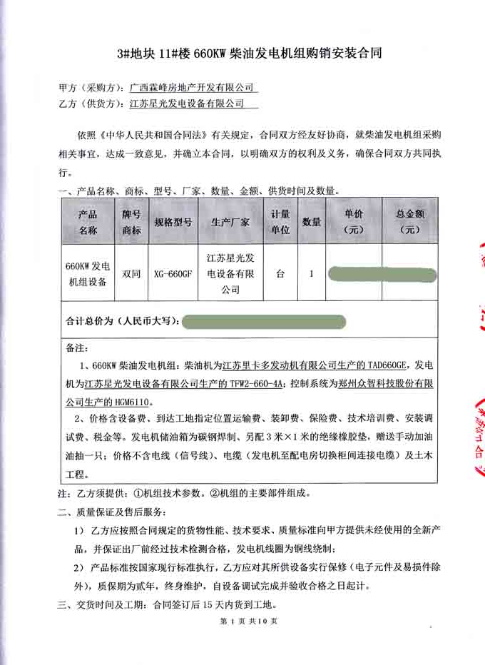2016年6月21日,我江蘇星光發電設備有限公司成功與廣西霖峰房地產開發有限公司簽訂3#塊地11#樓660KW柴油發電機組購銷安裝合同,我公司為其提供一臺發電機組配置為為江蘇里卡多發動機配星光發電機和眾智控制器。發電機產品購銷合同如下: