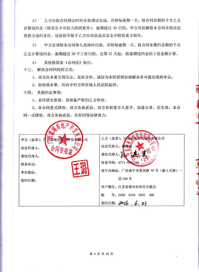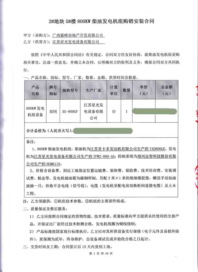 2016年6月21日,我江蘇星光動力集團成功與廣西霖峰房地產開發有限公司簽訂2#塊地5#樓800KW柴油發電機組購銷安裝合同,我公司為其提供一臺配置為為江蘇里卡多發動機配星光發電機和眾智控制器的發電機組,并負責機組的運輸安裝和調試工作及對發電機操作人員進行培訓。發電機產品購銷合同如下: