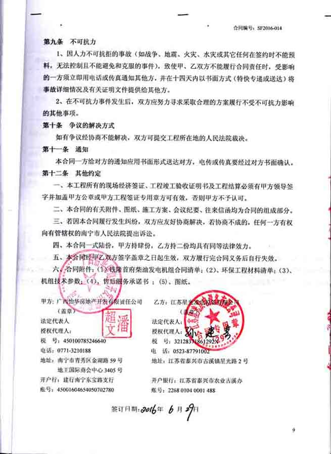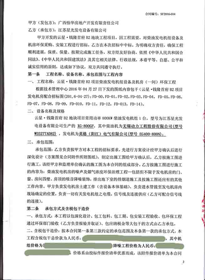 2016年6月29日,我江蘇星光動力集團成功與廣西怡華房地產開發有限責任公簽訂云星?錢隆首府B塊地(12號樓、13號樓)柴油發電機組設備及機房環保采購、安裝工程合同。我公司為其提供發電機組一臺并負責機組的運輸安裝調試等工作,按照工程招標要求進行方案設計,制定施工圖并按施工圖進行柴油發電機房的噪聲及煙氣濃度環保治理工程進行施工。