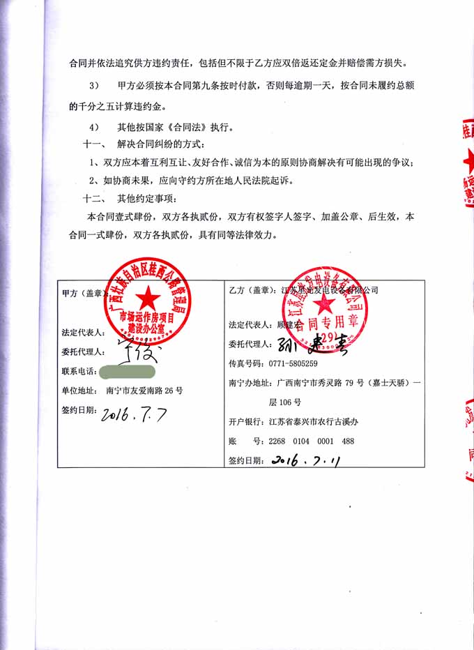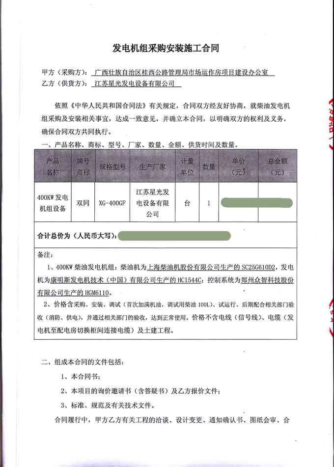2016年6月29日,廣西壯族自治區桂西公路管理局市場運作房項目建設辦公室與我公司簽訂發電機組采購安裝施工合同,我公司負責提供雙同牌400KW發電機組設備一臺及機組的安裝調試、試運行、后期配合相關部門驗收(消防、供電),并通過相關部門的驗收,達到正常使用等工作。發電機產品購銷合同如下:
