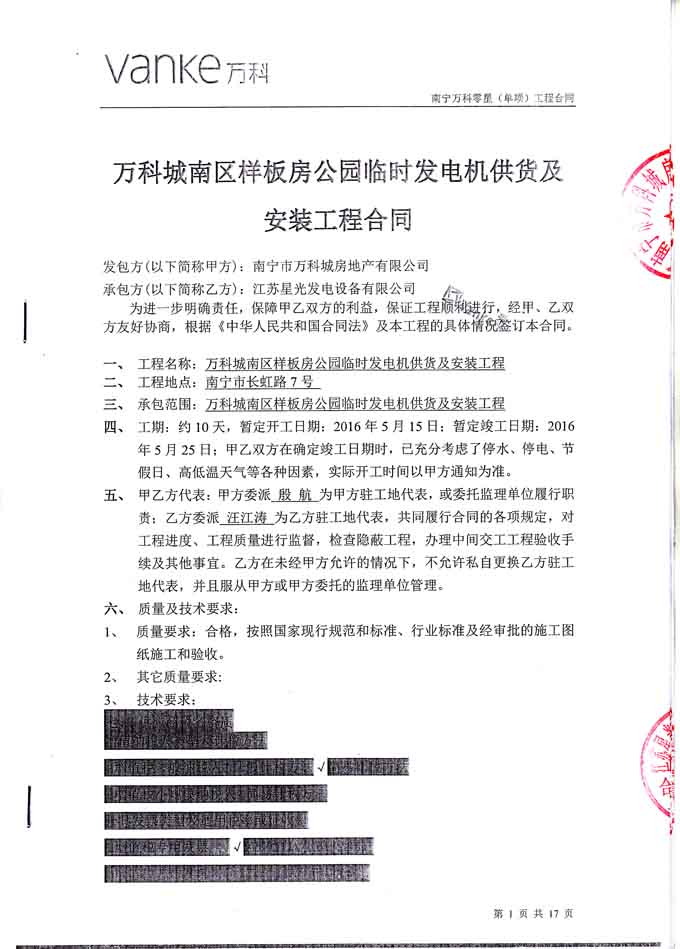 2016年6月22日,我公司與南寧市萬科城房地產(chǎn)有限公司成功簽訂萬科城南區(qū)樣板房臨時發(fā)電機(jī)供貨及安裝工程合同,我公司負(fù)責(zé)為其提供一臺5KW汽油發(fā)電機(jī)和配電箱,并負(fù)責(zé)發(fā)電機(jī)在運(yùn)輸及安裝。合同如下: