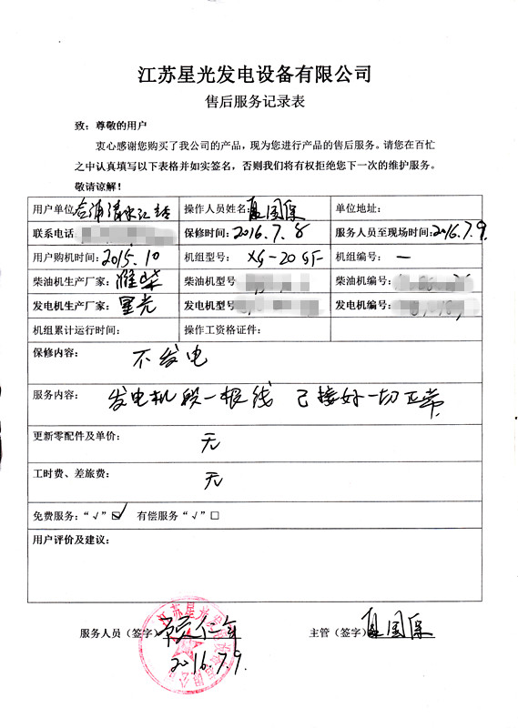 2016年7月8日,合浦清水江塘公司20kw濰柴柴油發(fā)電機(jī)不發(fā)電,本公司售后服務(wù)人員當(dāng)天就抵達(dá)合浦對該公司發(fā)電機(jī)進(jìn)行了維修保養(yǎng),期間經(jīng)過層層零部件的檢查,忽然發(fā)現(xiàn)發(fā)電機(jī)斷一根線,工作人員已接好并能重啟濰柴柴油發(fā)電機(jī),一切正常。事后,作者有話要說:天氣炎熱,廣西地區(qū)已達(dá)36℃的高溫天氣,在天氣越來越炎熱情況下,如果斷電,發(fā)電機(jī)必不可少的啟動(dòng),在啟動(dòng)過程中,希望各位用戶能注意檢查和維護(hù)保養(yǎng)發(fā)電機(jī),俗話說:出門5分鐘,流汗兩小時(shí)。壞了發(fā)電機(jī)事小,熱了自己可是大事件。
