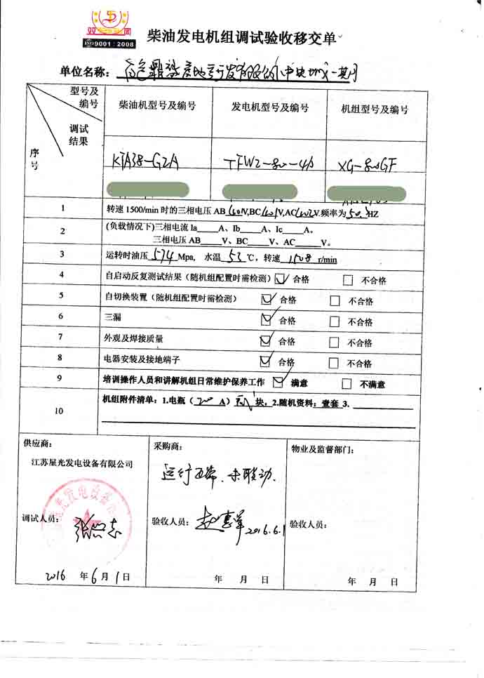 2016年6月1日,我公司技術服務人員到中央城一期的發電機組安裝現場,對百色鼎盛房地產開發有限公司向我公司購買的800KW康明斯柴油發電機組進行調試交付工作,并培訓操作人員和講解機組日常維護保養工作。以下是發電機組調試驗收單: