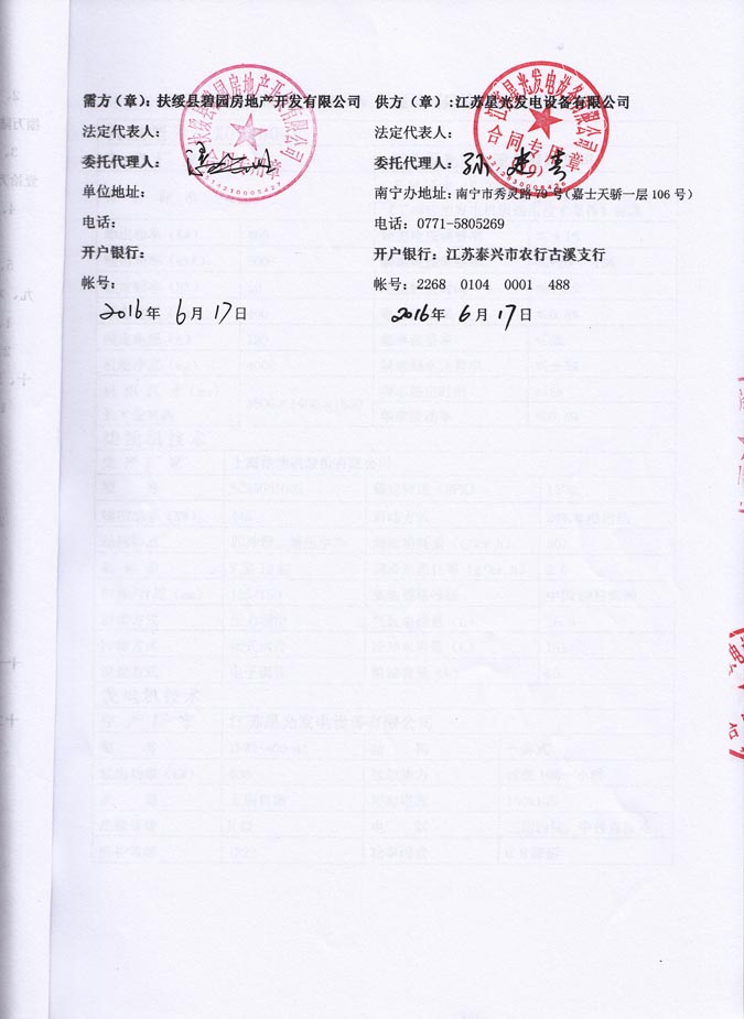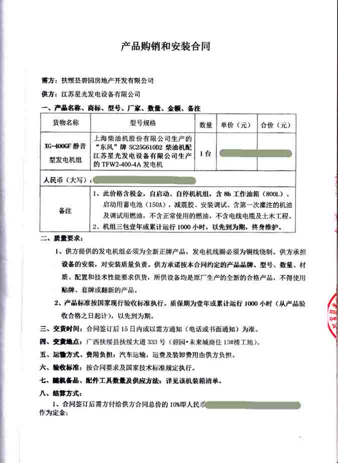 2016年6月17日,扶綏縣碧園房地產(chǎn)開發(fā)有限公司與我公司柴油發(fā)電機組購銷和安裝合同,我公司為其提供一臺400KW靜音型發(fā)電機組,機組配置為上海柴油機股份有限公司生產(chǎn)的“東風(fēng)”牌柴油機和我公司自主研發(fā)生產(chǎn)的星光發(fā)電機。我公司按照合同要求,為其提供機組及機組相關(guān)附件的運輸安裝和機組的調(diào)試工作,并為用戶培訓(xùn)操作人員,產(chǎn)品購銷合同如下: