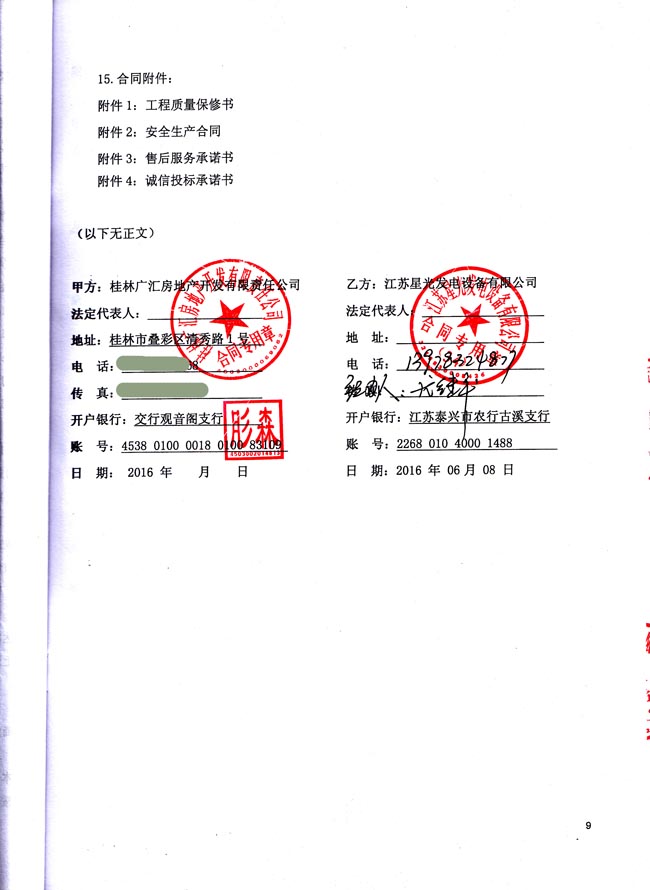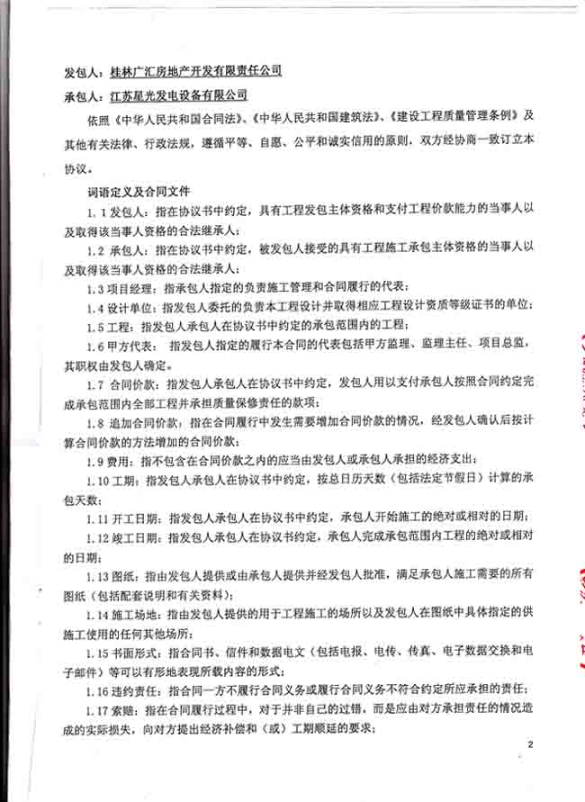 2016年6月8日,桂林廣匯房地產(chǎn)開發(fā)有限責(zé)任公司與我公司簽訂清華園一期發(fā)電機(jī)采購(gòu)及安裝工程合同,我公司為其提供一臺(tái)常用功率450KW柴油發(fā)電機(jī)組和機(jī)組配備的電瓶、油箱、輸油管、排煙管等設(shè)備,以及機(jī)組的運(yùn)輸安裝調(diào)試工作。機(jī)組配置選用的品牌為重慶康明斯柴油機(jī);上海科浦發(fā)電機(jī);鄭州眾智控制器。發(fā)電機(jī)產(chǎn)品購(gòu)銷合同如下: