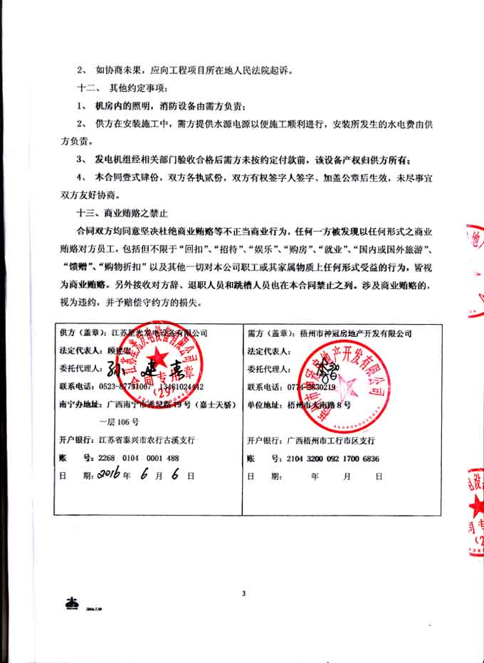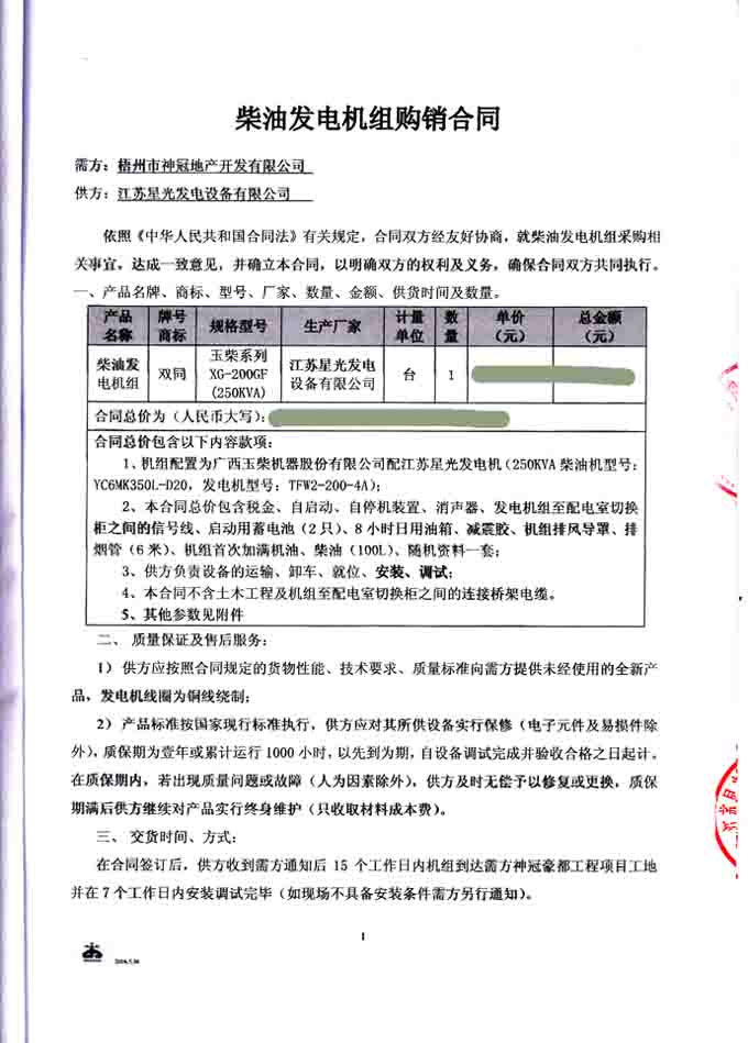 2016年6月6日,我公司發(fā)電機(jī)組憑借優(yōu)良的產(chǎn)品質(zhì)量及完善的售后服務(wù),與梧州市神冠房地產(chǎn)開發(fā)有限公司成功簽訂柴油發(fā)電機(jī)組購(gòu)銷合同,我公司為其提供一臺(tái)200KW玉柴發(fā)電機(jī)組(機(jī)組配置為玉柴柴油機(jī)配星光發(fā)電機(jī)),并負(fù)責(zé)機(jī)組的運(yùn)輸安裝調(diào)試及用戶操作人員的培訓(xùn)。發(fā)電機(jī)產(chǎn)品購(gòu)銷合同如下: