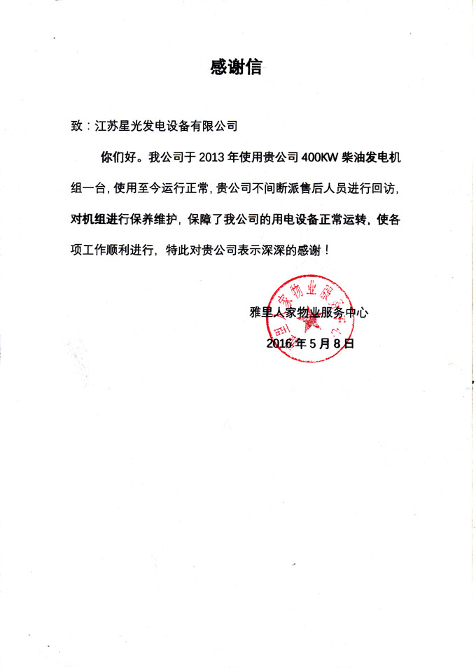 2016年5月8日,我江蘇星光動力集團(tuán)售后人員收到雅里人家物業(yè)服務(wù)中心的感謝信,對我公司提供的400KW柴油發(fā)電機(jī)組及售后服務(wù)反應(yīng)迅速,上門維修保養(yǎng)服務(wù)到位,認(rèn)真的售后服務(wù)工作表示感謝!