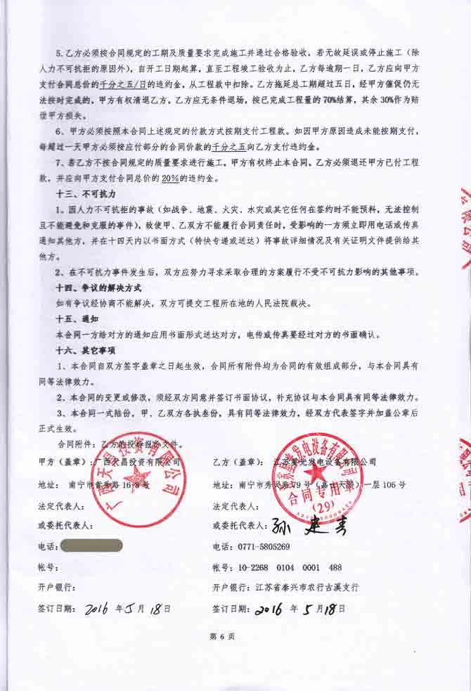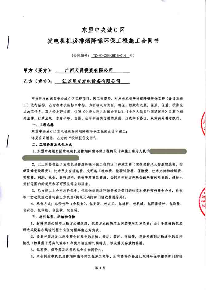 2016年5月18日,廣西天昌投資有限公司與我公司簽訂東盟中央城C區發電機機房排煙降噪環保工程施工合同,我公司為其提供一臺630KW康明斯發電機組的機房噪聲、廢氣綜合治理、環保工程及機房照明、排風工程的設計及施工。合同如下: