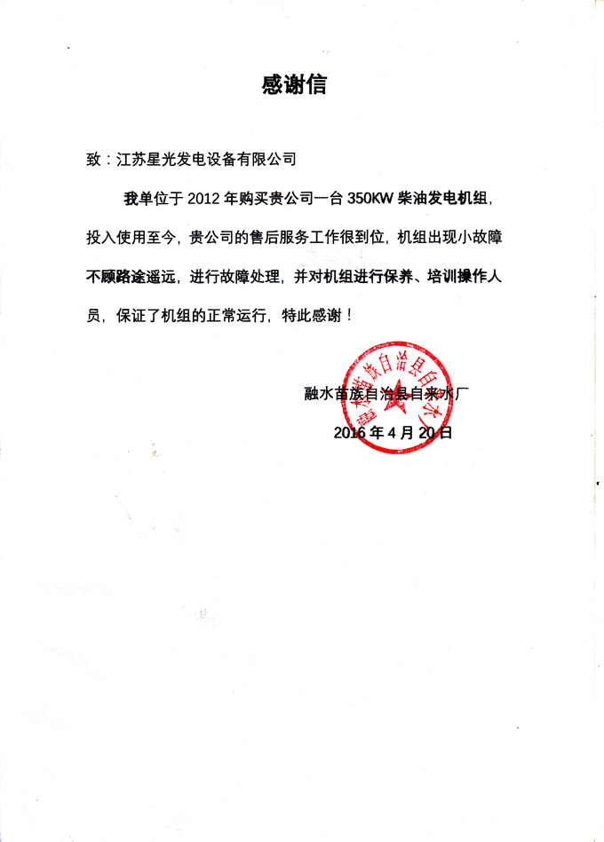 2016年4月20日,收到融水苗族自治縣自來水廠致我江蘇星光發電設備有限公司感謝信,對我公司提供的350KW柴油發電機組及其發電機售后服務工作反應迅速,上門維修保養服務到位,認真的售后服務態度表示感謝!