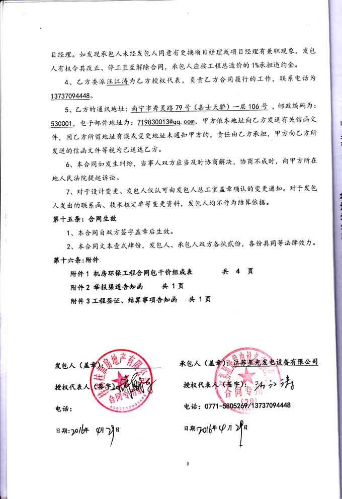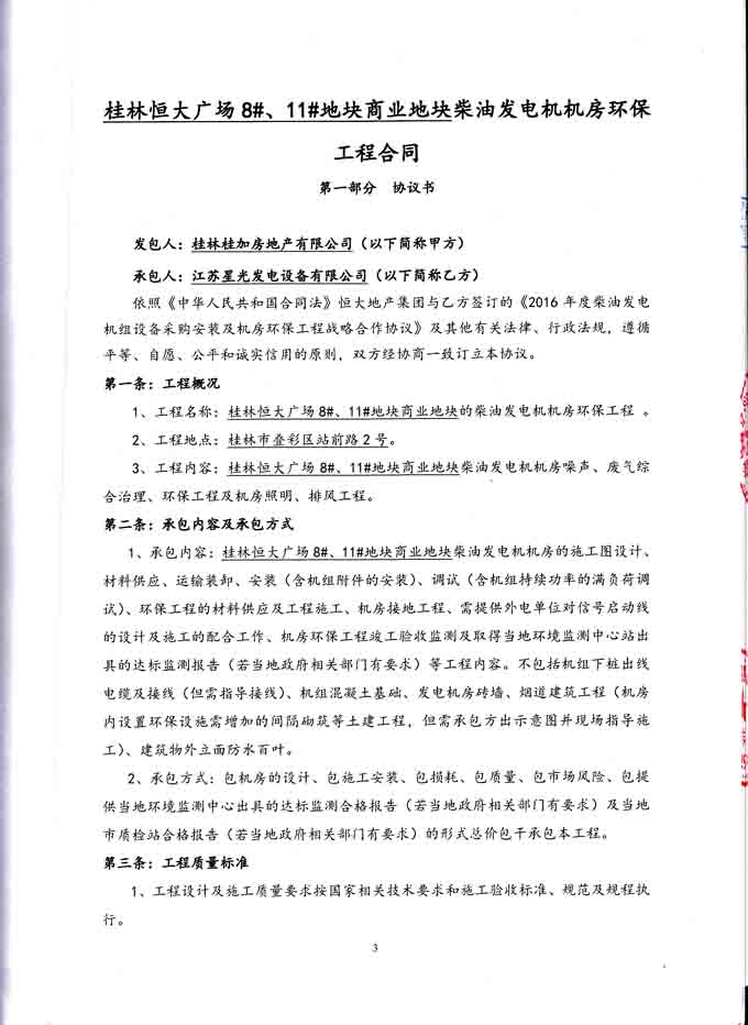 2016年4月29日,林桂加房地產有限公司與我公司簽訂了桂林恒大廣場8#、11#地塊商業地塊柴油發電機機房環保工程合同,我公司為其提供1000KW柴油發電機組和1200KW柴油發電機組的機房噪聲、廢氣綜合治理、環保工程及機房照明、排風工程。合同如下: