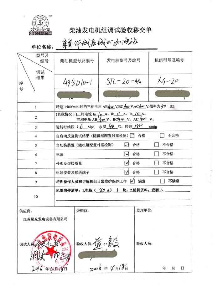 2016年4月18日,在來賓忻城城北加油站的發電機組安裝現場,我司技術人員對柴油發電機組進行調試交付工作。之前來賓忻城城北加油站成功與我公司簽訂20KW濰柴柴油發電機組采購合同,此刻已經做好安裝調試工作,并培訓其操作人員和講解機組日常維護保養注意事項,以下是發電機組調試驗收單: