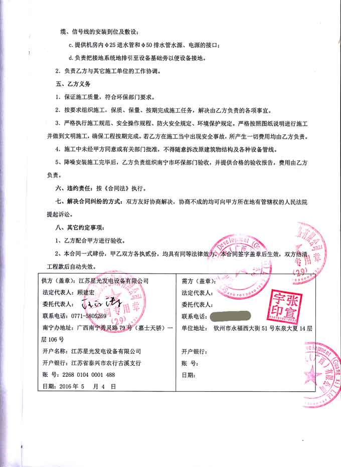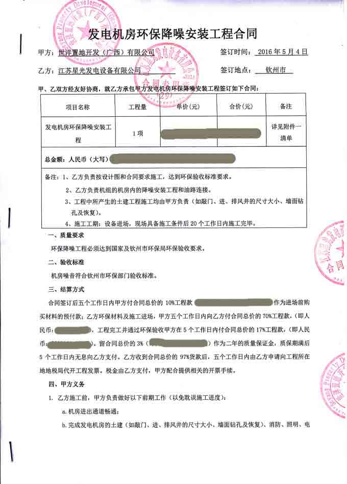 2016年5月4日,世洋置地開發(廣西)有限公司工程與我公司簽訂800KW柴油發電機組機房環保降噪安裝工程合同,我公司負責發電機組在的降噪工程安裝及油路連接,并保證環保降噪工程達到環保局的驗收要求,合同如下: