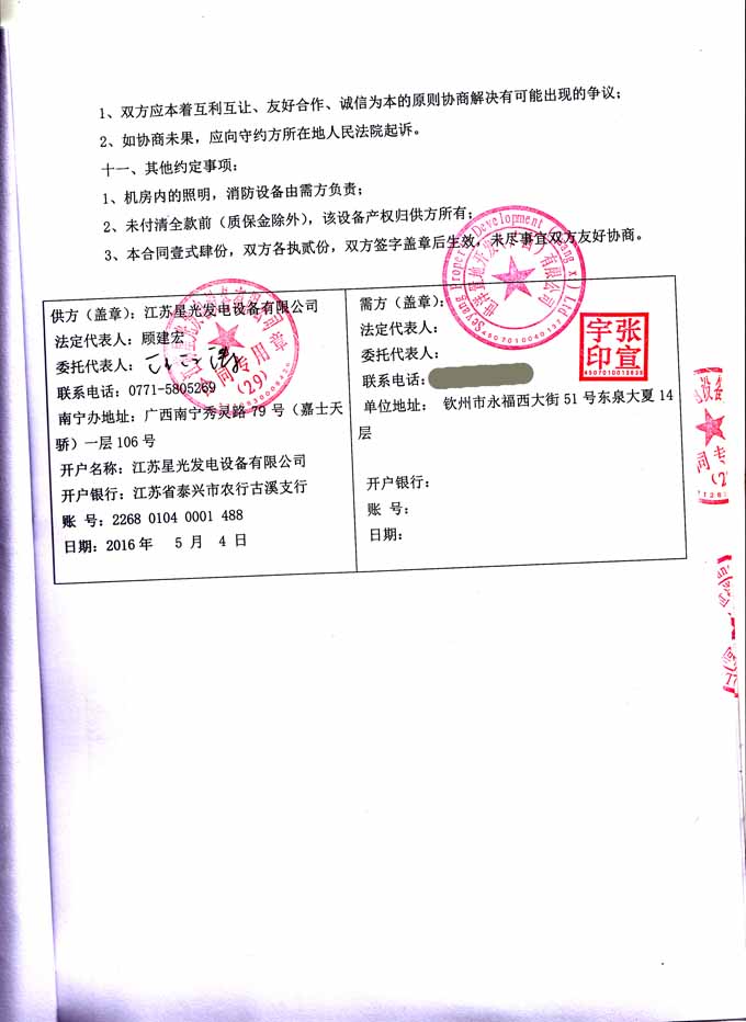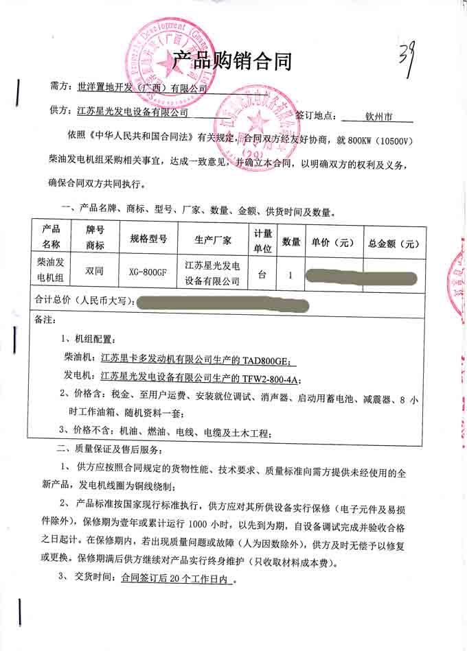 2016年5月4日,我公司成功與世洋置地開發(廣西)有限公司簽訂800KW柴油發電機組產品購銷合同,我公司為其提供配置為柴油機:江蘇里卡多發動機生產的TAD800GE;發電機:江蘇星光發電設備有限公司機生產的TFW2-800-4A的里卡多柴油發電機組一臺。發電機產品購銷合同如下:
