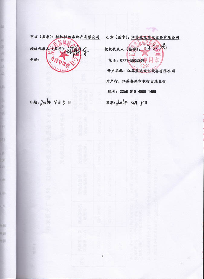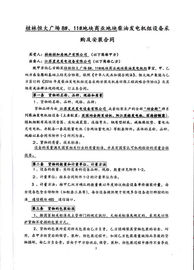 2016年4月5日,我公司發(fā)電機(jī)產(chǎn)品憑借精湛的技術(shù),優(yōu)良的品質(zhì)和完善的售后服務(wù)體系,成功與桂林桂加房地產(chǎn)有限公司簽訂桂林恒大廣場(chǎng)8#、11#地塊商業(yè)地塊珀金斯發(fā)電機(jī)組設(shè)備采購(gòu)及安裝工程合同,我公司為其提供1000KW柴油發(fā)電機(jī)組和1200KW柴油發(fā)電機(jī)組各一臺(tái),機(jī)組配置為珀金斯發(fā)動(dòng)機(jī)配英格發(fā)電機(jī)及深海控制器。發(fā)電機(jī)產(chǎn)品購(gòu)銷(xiāo)合同如下: