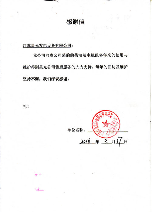2016年3月17日,我星光公司售后服務(wù)人員收到廣西華保盛物業(yè)服務(wù)有限公司五環(huán)星光住宅小區(qū)物業(yè)服務(wù)中心的感謝信,對我公司服務(wù)反應(yīng)迅速,上門維修保養(yǎng)柴油發(fā)電機組服務(wù)到位,認真的售后服務(wù)工作表示感謝!
