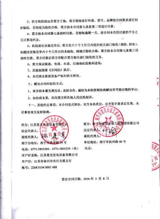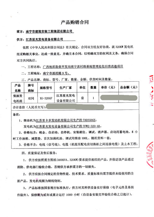 2016年3月8日,南寧市建筑安裝工程集團有限公司與我公司簽訂廣西地質(zhì)勘查開發(fā)局南寧淡村路基地管理處濰坊舊房改造項目發(fā)電機組產(chǎn)品購銷合同,我公司為其提供一臺320KW里卡多發(fā)電機組,機組配置為里卡多發(fā)動機配星光發(fā)電機。柴油發(fā)電機產(chǎn)品購銷合同如下: