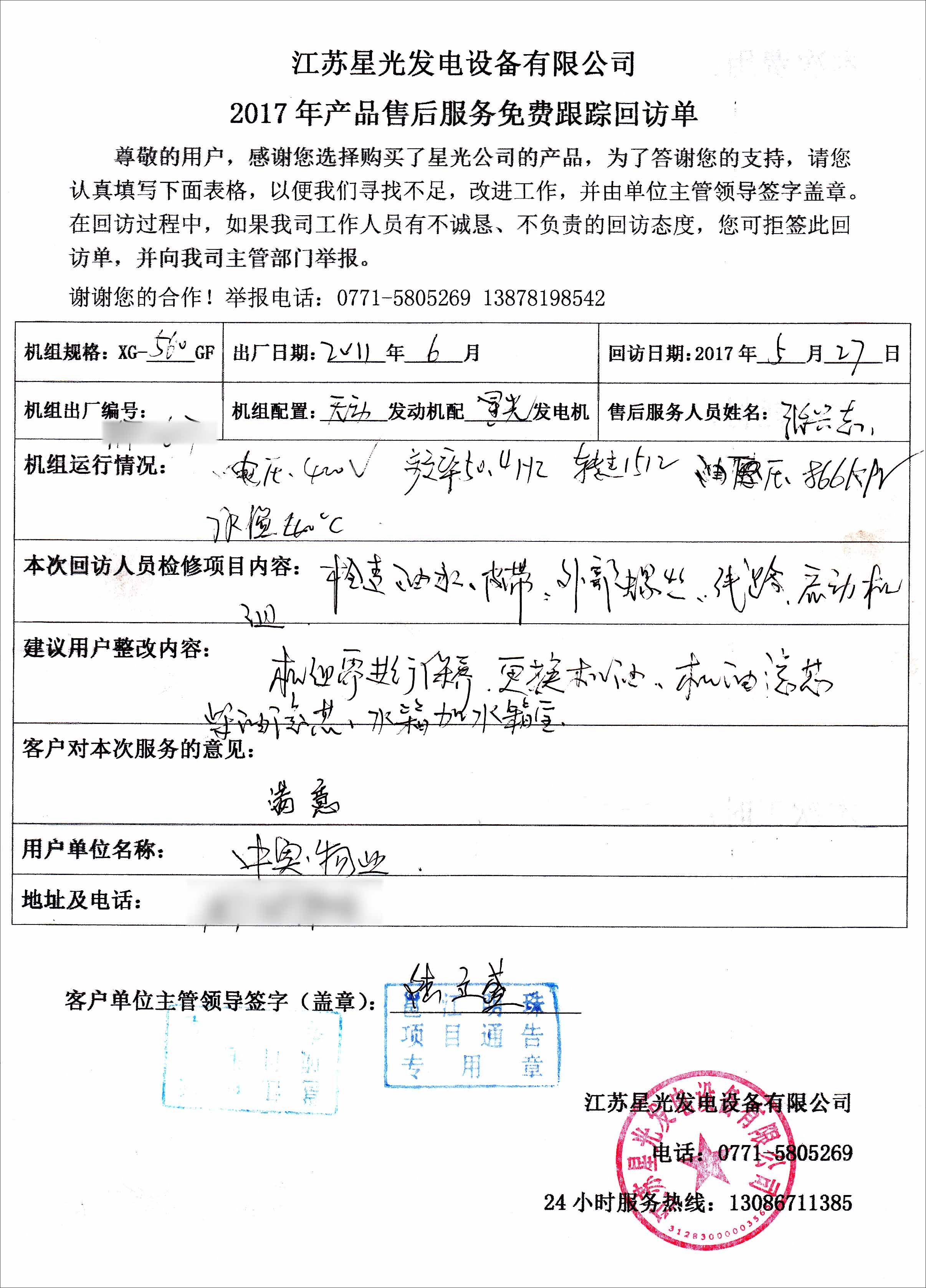 5月27日,我公司售后技術(shù)員張師傅到中奧物業(yè)進行免費售后跟蹤回訪。其于2011年6月在我司購買配置為無動發(fā)動機配星光發(fā)電機的560KW無動發(fā)電機組一臺。張師傅現(xiàn)場檢查了機油、水、皮帶、外部螺絲、線路并啟動機組,建議用戶更換機油、機油濾芯、柴油濾芯、水箱加水箱寶等,對機組進行保養(yǎng)以延長機組的使用壽命。
