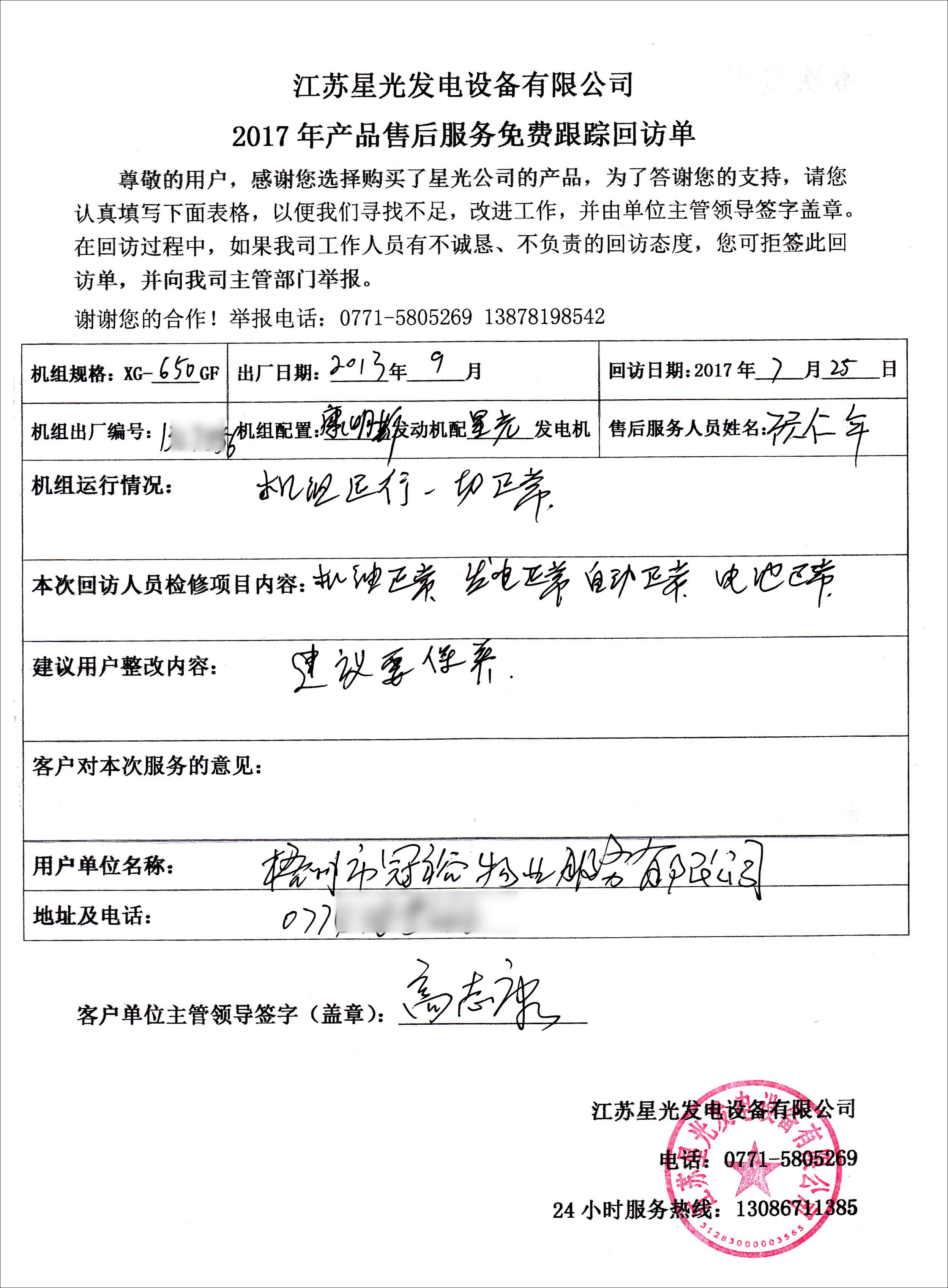7月25日,我公司售后技術員顧師傅到梧州冠裕物業(yè)公司對其于2013年9月在我司購買的兩臺康明斯發(fā)電機組進行免費售后回訪服務。顧師傅檢查了機油、電池及機組自動化、發(fā)電情況均正常。因機組已使用較長時間,顧師傅建議對機組進行保養(yǎng),以確保機組正常運行。更多關于康明斯發(fā)電機組售后服務歡迎撥打星光熱線:13878198542