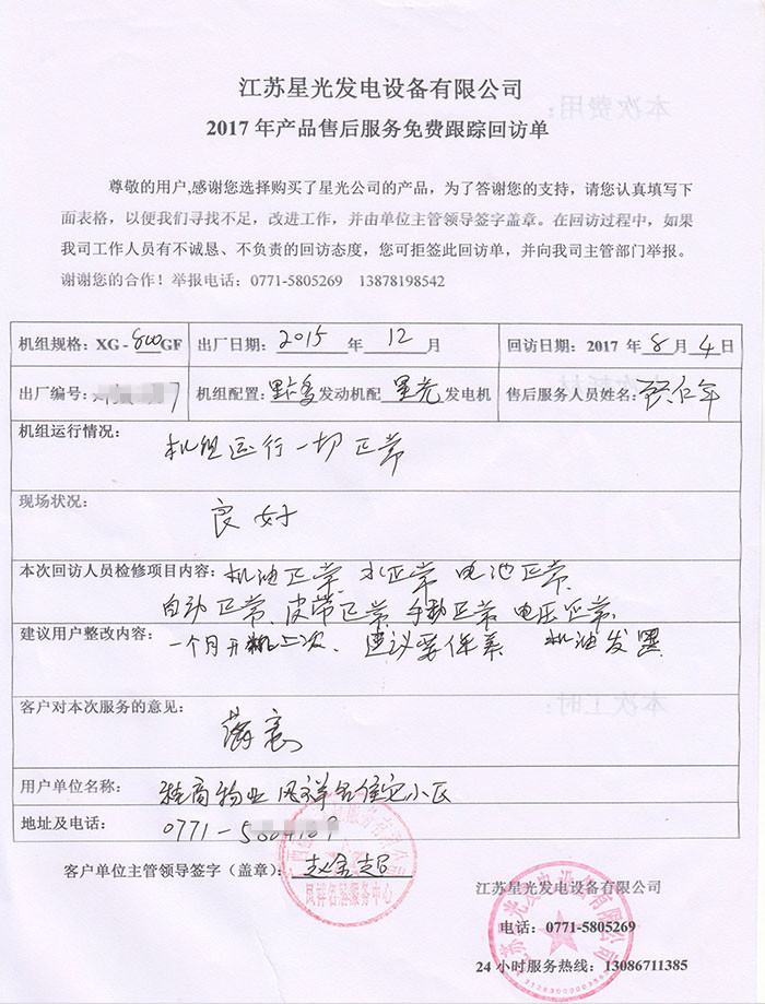 江蘇星光動力集團 >> 服務(wù)跟蹤 >> 我公司售后技術(shù)員顧師傅為南寧鳳祥名居小區(qū)里卡多發(fā)電機組免費上門回訪