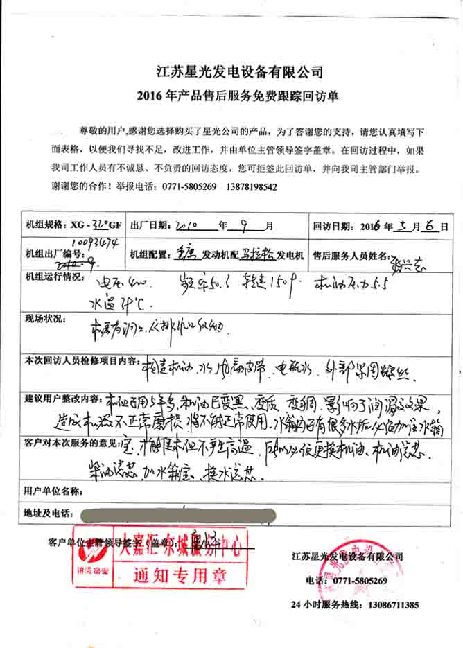2016年5月6日,我公司技術(shù)人員到大嘉匯東城服務(wù)中心進(jìn)行發(fā)電機(jī)組免費(fèi)回訪。本次回訪的機(jī)組是2010年我公司為其提供的重慶康明斯柴油機(jī)配馬拉松發(fā)電機(jī)的320KW發(fā)電機(jī)組。技術(shù)人員啟動機(jī)組檢查機(jī)油、水箱水、風(fēng)葉皮帶、電瓶水、外部堅(jiān)固螺絲等部件,并針對機(jī)組目前的運(yùn)行狀況給出建議。下面是本次回訪記錄: