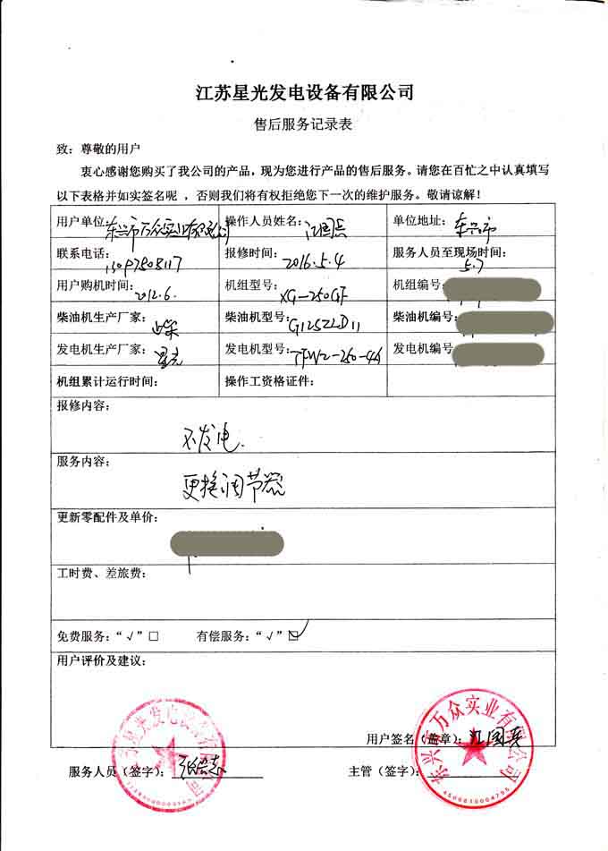 2016年5月7日,我公司就東興市萬(wàn)眾實(shí)業(yè)有限公司來(lái)電報(bào)修柴油發(fā)電機(jī)組不發(fā)電的故障安排人員到場(chǎng)檢修。經(jīng)技術(shù)人員檢查,機(jī)組為250KW上柴發(fā)電機(jī)組,故障原因?yàn)檎{(diào)節(jié)器損壞,更換調(diào)節(jié)器后機(jī)組運(yùn)行已一切正常。以下是售后服務(wù)記錄表: