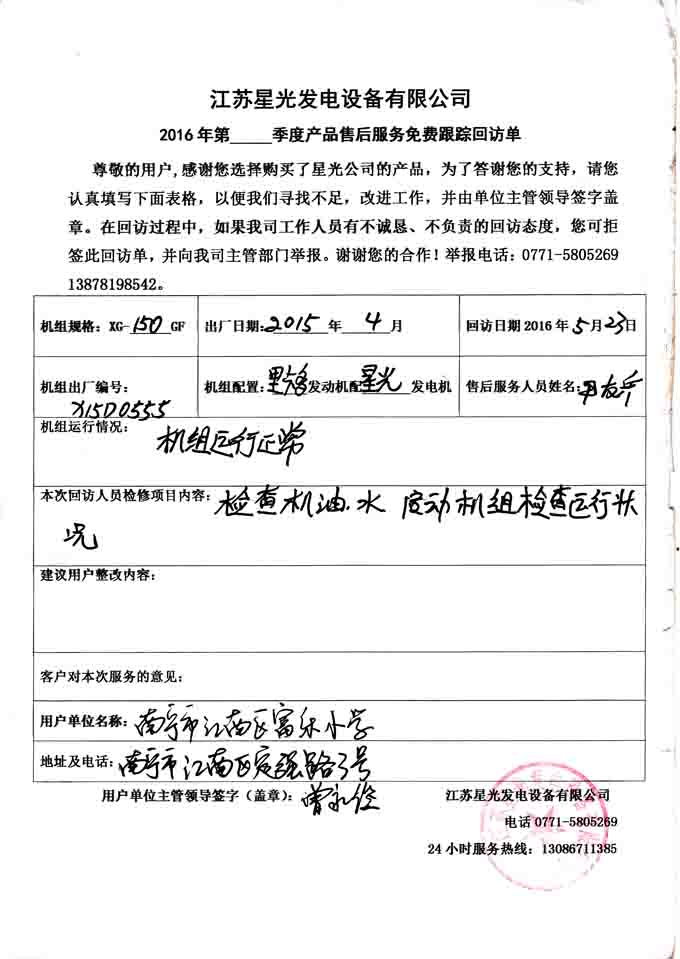 2016年5月23日,我江蘇星光公司售后服務(wù)部技術(shù)人員到南寧市江南區(qū)富樂(lè)小學(xué),對(duì)其向我公司購(gòu)買的150KW柴油發(fā)電機(jī)組(機(jī)組配置為里卡多柴油機(jī)配星光發(fā)電機(jī))進(jìn)行免費(fèi)回訪。本次回訪的主要內(nèi)容有:檢查機(jī)組的機(jī)油、水,并啟動(dòng)機(jī)組檢查機(jī)組的運(yùn)氣狀況。下面是本次回訪記錄: