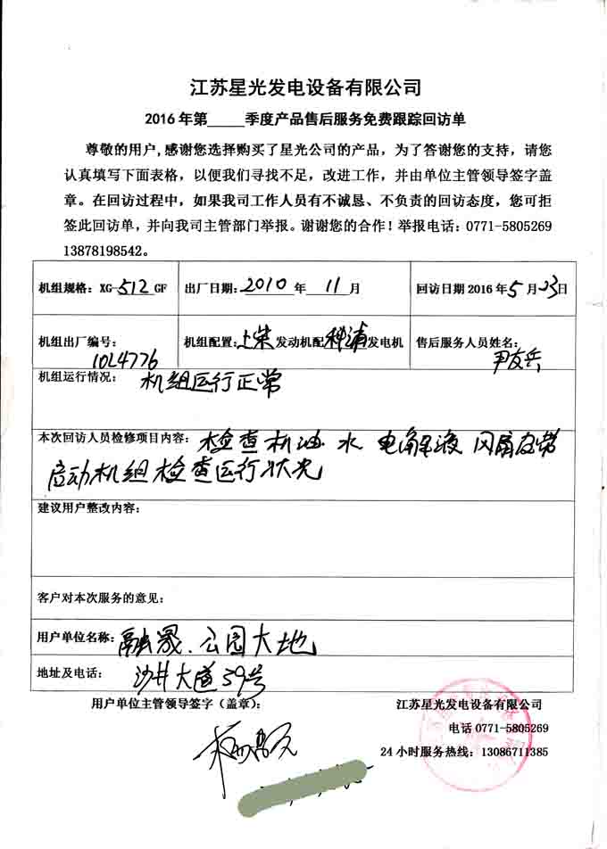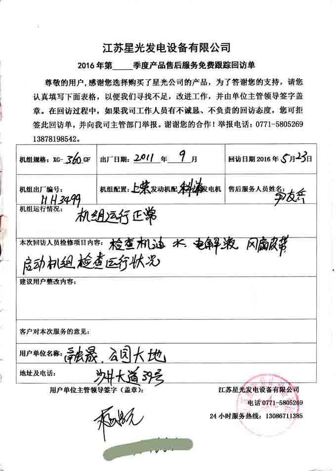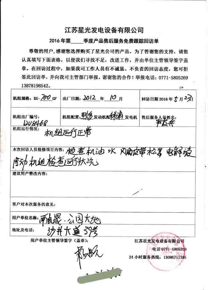 2016年5月23日,我江蘇星光動(dòng)力集團(tuán)技術(shù)服務(wù)人員到融晟公園大地,對(duì)我公司為其提供的360KW和512KW柴油發(fā)電機(jī)組(機(jī)組配置為上柴柴油機(jī)配上海科浦發(fā)電機(jī))各一臺(tái)、700KW柴油發(fā)電機(jī)組(機(jī)組配置為里卡多發(fā)單機(jī)配科浦發(fā)電機(jī))一臺(tái)進(jìn)行免費(fèi)回訪。本次回訪檢查機(jī)組的機(jī)油、水箱水、電解液和風(fēng)扇皮帶等部件,并啟動(dòng)機(jī)組檢測(cè)機(jī)組運(yùn)行狀況。