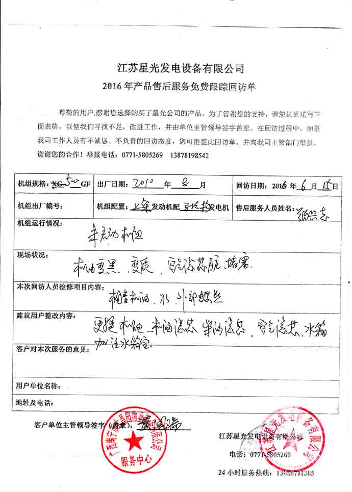 2016年6月15日,我公司技術(shù)人員到廣西南寧市大昌園物業(yè)服務(wù)有限公司進行發(fā)電機組回訪工作。本次回訪的是該公司于2010年向我公司購買一臺500KW柴油發(fā)電機組(機組備注為上柴柴油機配上海馬拉松發(fā)電機),技術(shù)人員對機組的機油、水箱水、外部螺絲緊固情況進行檢查,發(fā)現(xiàn)機油長久使用已經(jīng)變質(zhì)變黑,空氣濾芯器臟且被堵塞,所以用戶更換機油、機油濾芯、柴油濾芯、空氣濾芯、為水箱加注水箱寶,并要注意機組的保養(yǎng)。下面是本次回訪記錄: