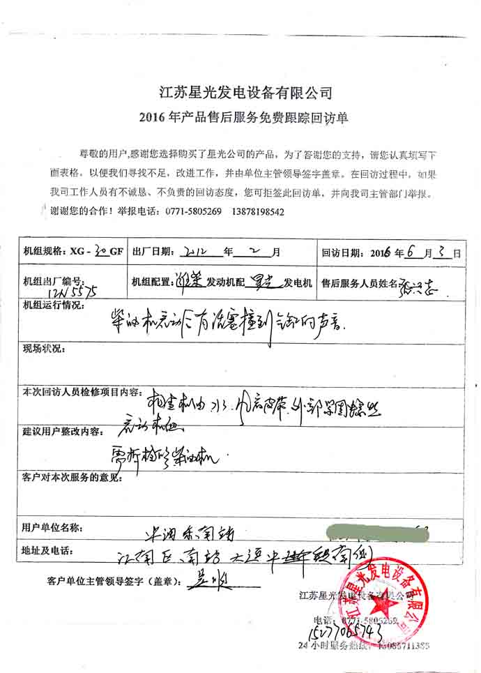 2016年6月3日,我江蘇星光公司售后服務(wù)部技術(shù)人員到中國(guó)石油東南加油站,對(duì)其向我公司購買的30KW柴油發(fā)電機(jī)組(機(jī)組配置為濰柴發(fā)動(dòng)機(jī)配星光發(fā)電機(jī))進(jìn)行免費(fèi)回訪。本次回訪技術(shù)人員檢查了機(jī)組的機(jī)油、水箱水、風(fēng)扇皮帶機(jī)外部緊固螺絲等部件,并啟動(dòng)機(jī)組,發(fā)現(xiàn)柴油機(jī)需要進(jìn)行維修。下面是本次回訪記錄: