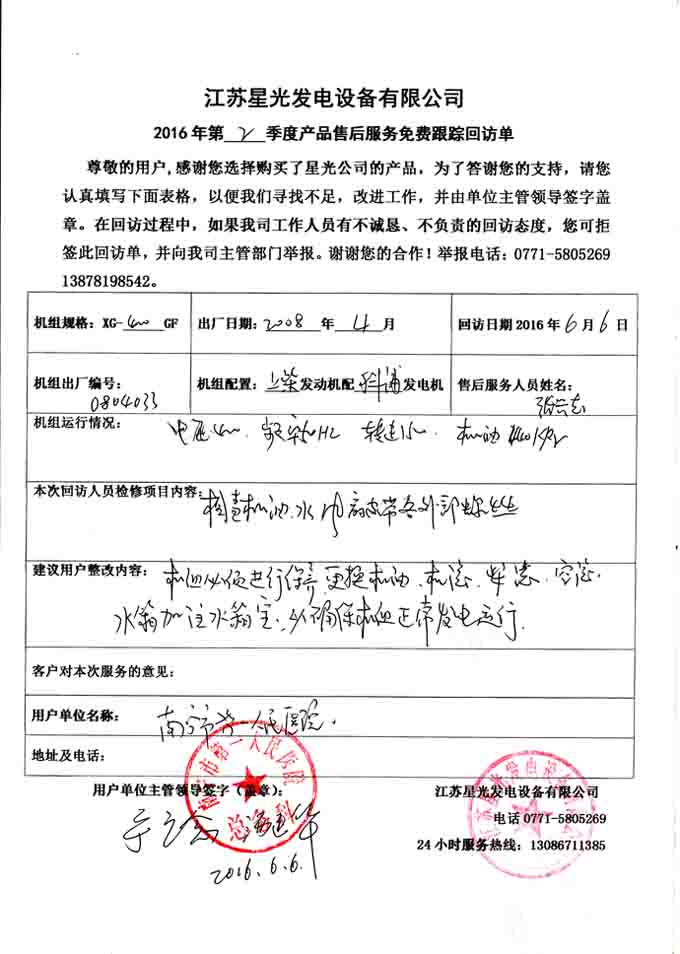 2016年6月6日,我星光公司售后技術(shù)人員到南寧市第一人民醫(yī)院,對(duì)我公司為其提供的400KW上柴柴油發(fā)電機(jī)組進(jìn)行回訪。技術(shù)人員到達(dá)發(fā)電機(jī)房后對(duì)機(jī)組的機(jī)油、水箱水、風(fēng)扇皮帶、外部螺絲緊固等部件情況進(jìn)行檢查,并啟動(dòng)機(jī)組檢測(cè)機(jī)組各參數(shù)正常等。下面是本次回訪記錄: