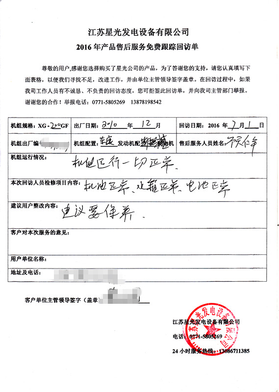 對于發(fā)電機售后服務(wù),江蘇星光發(fā)電設(shè)備有限公司可提供售前售后一條龍服務(wù),我公司的發(fā)電機設(shè)計穩(wěn)重,巧妙,質(zhì)量合格,耐用,價格公道,符合市場需求,在供應(yīng)康明斯發(fā)電機,沃爾沃發(fā)電機,里卡多發(fā)電機,玉柴發(fā)電機等也是市場上用戶的需求,同時也是江蘇星光動力集團供應(yīng)發(fā)電機中銷量最好的發(fā)電機,以下是2016年7月1日,本公司售后服務(wù)人員回訪記錄單: