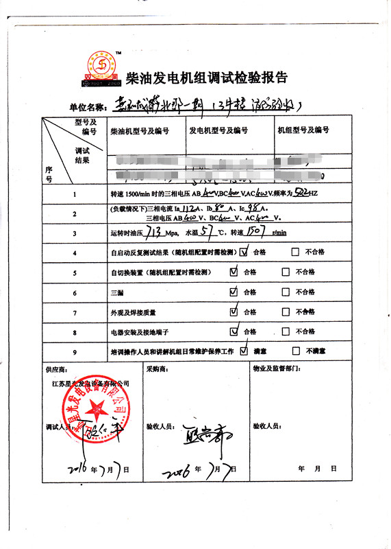 2016年7月7日,我公司工作人員直達(dá)南寧嘉和城現(xiàn)場(chǎng)指揮安裝調(diào)試一臺(tái)640KW柴油發(fā)電機(jī),調(diào)試結(jié)果為:自啟動(dòng)反復(fù)測(cè)試結(jié)果合格,自切換裝置合格,三漏合格,外觀(guān)及焊接質(zhì)量合格,電器安裝及接地端子合格。此外,我公司工作人員還對(duì)嘉和城北郡一期的操作人員進(jìn)行了培訓(xùn)以及講解機(jī)組日常的維護(hù)保養(yǎng)工作,該公司對(duì)此非常滿(mǎn)意。