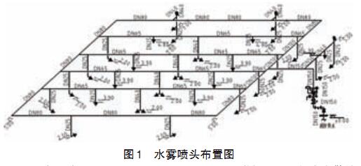 (1)根據柴油發(fā)電站布置,布置水霧噴頭30個,另油箱間設置3個噴頭進行保護。共33個,計算秒流量34.65L/s,設計秒流量3.8.1L/s,消防水進水管管徑DN150,設計流速1.98m/s<5m/s.水霧噴頭布置見圖1.