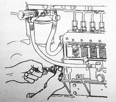 第一種方法:拆下第一缸的高壓油管,轉(zhuǎn)動(dòng)曲軸,使第1缸活塞處于膨脹沖程始點(diǎn),此時(shí)飛輪殼上的指針對(duì)準(zhǔn)飛輪上的“0”度線。然后反轉(zhuǎn)柴油發(fā)電機(jī)組曲軸,使檢視窗上的指針對(duì)準(zhǔn)飛輪上相當(dāng)于噴濺提前角規(guī)定的角度,然后松開噴油泵傳動(dòng)軸接合盤上的兩個(gè)固緊螺釘,按噴油泵的轉(zhuǎn)動(dòng)方向,緩慢而均勻地轉(zhuǎn)動(dòng)噴油泵凸輪軸至第1缸出油口油面剛剛發(fā)生波動(dòng)的瞬時(shí)為止,如下圖所示,并擰緊接合盤上的兩個(gè)螺釘。