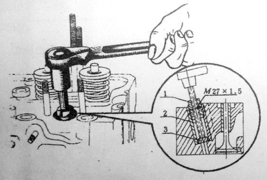 圖1:噴油器水套的拆卸;1-螺母;2-螺桿;3-墊塊