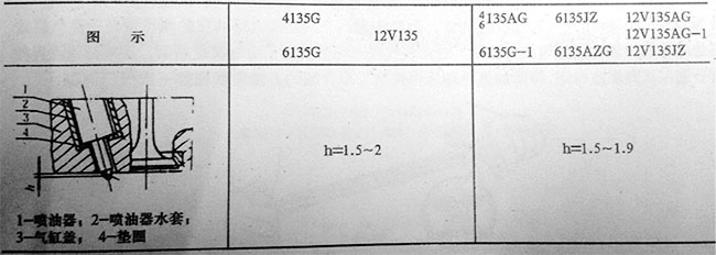 噴油器與氣缸蓋之間用銅墊圈密封燃燒氣體,同時借以調(diào)整發(fā)電機(jī)組噴油孔露出氣缸蓋底平面之距離。噴油器裝入氣缸蓋后,在均勻交替擰緊兩個固定噴油器螺栓的螺母時,不宜檸得過緊,其扭矩不得大于19.6-24.5N·m(2-2.5kgf-m)。檢修重裝噴油器時,應(yīng)檢查噴油器之噴孔中心露出氣缸蓋底平面的距離(對于新車或未拆卸的不必檢查),可用自制合適的量規(guī)進(jìn)行測量(如圖2)。此距離應(yīng)在下表(圖3)規(guī)定的范圍內(nèi)。