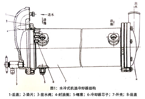 水冷式機(jī)油冷卻器為圓筒形,內(nèi)部有黃鋼管、散熱片和隔片組成的芯子。水在芯子的管內(nèi)流動;油在芯子與外殼的夾層流動,其基本結(jié)構(gòu)如圖1所示。