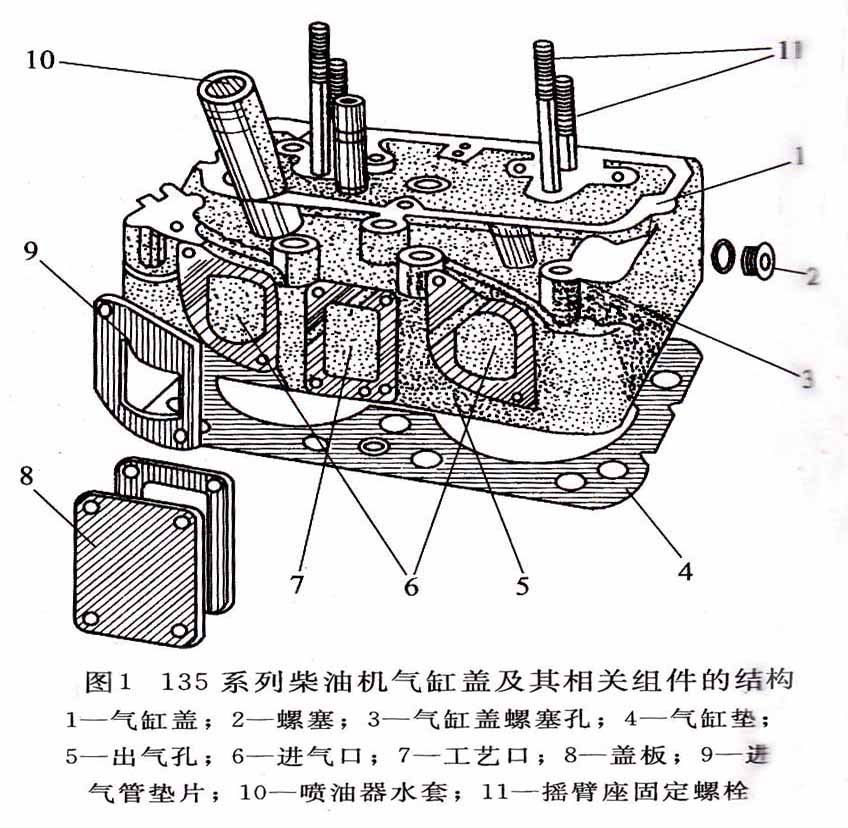 2、雙缸式,每兩個氣缸共用一個氣缸蓋(如圖1所示135系列柴油機(jī)氣缸蓋及其相關(guān)組件的結(jié)構(gòu));
