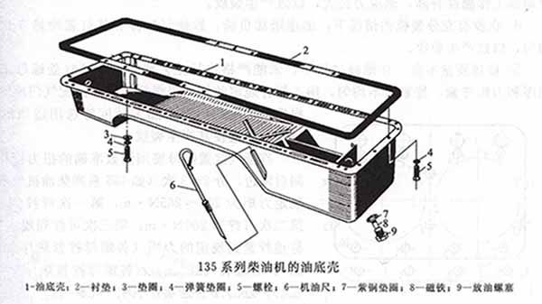 油底殼的結(jié)構(gòu)開關(guān)主要是根據(jù)機油的容量、柴油機的安裝位置以及在使用中的縱橫傾斜角度來決定。下圖為135系列柴油機的油底殼,為了保證潤滑油泵能經(jīng)常吸油,其后部較深,整個底部呈斜面以保證供油充足。對于熱負(fù)荷圈套的柴油機,油底殼帶有散熱片以降低機油的溫度。為防止?jié)櫥图R,油底殼中多設(shè)有擋油板。油底殼底部裝有磁性放油塞,以吸附潤滑油中的鐵屑和必要時放出潤滑油。